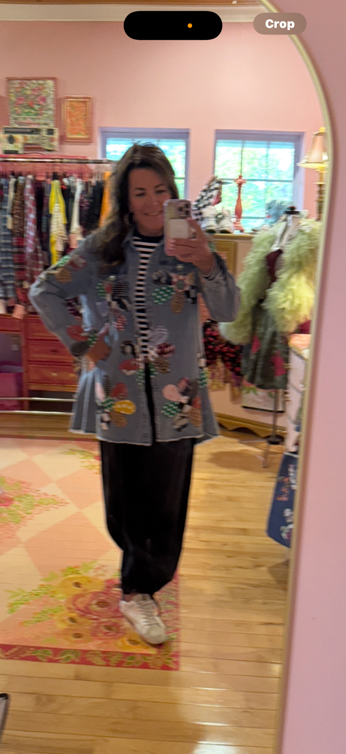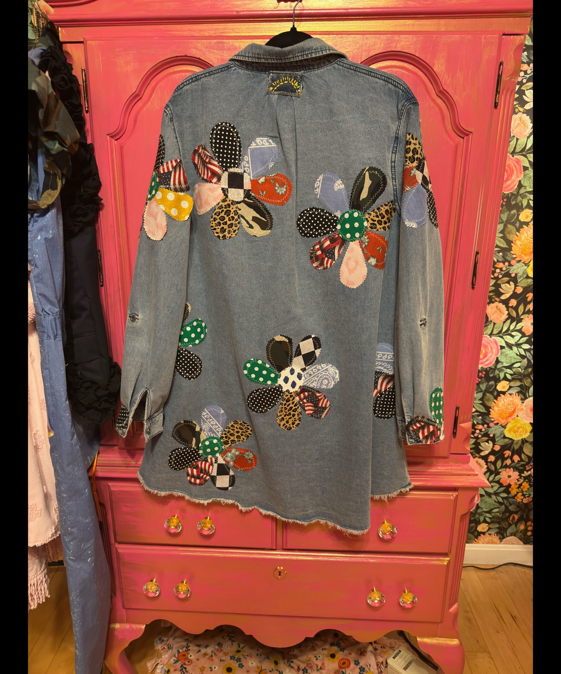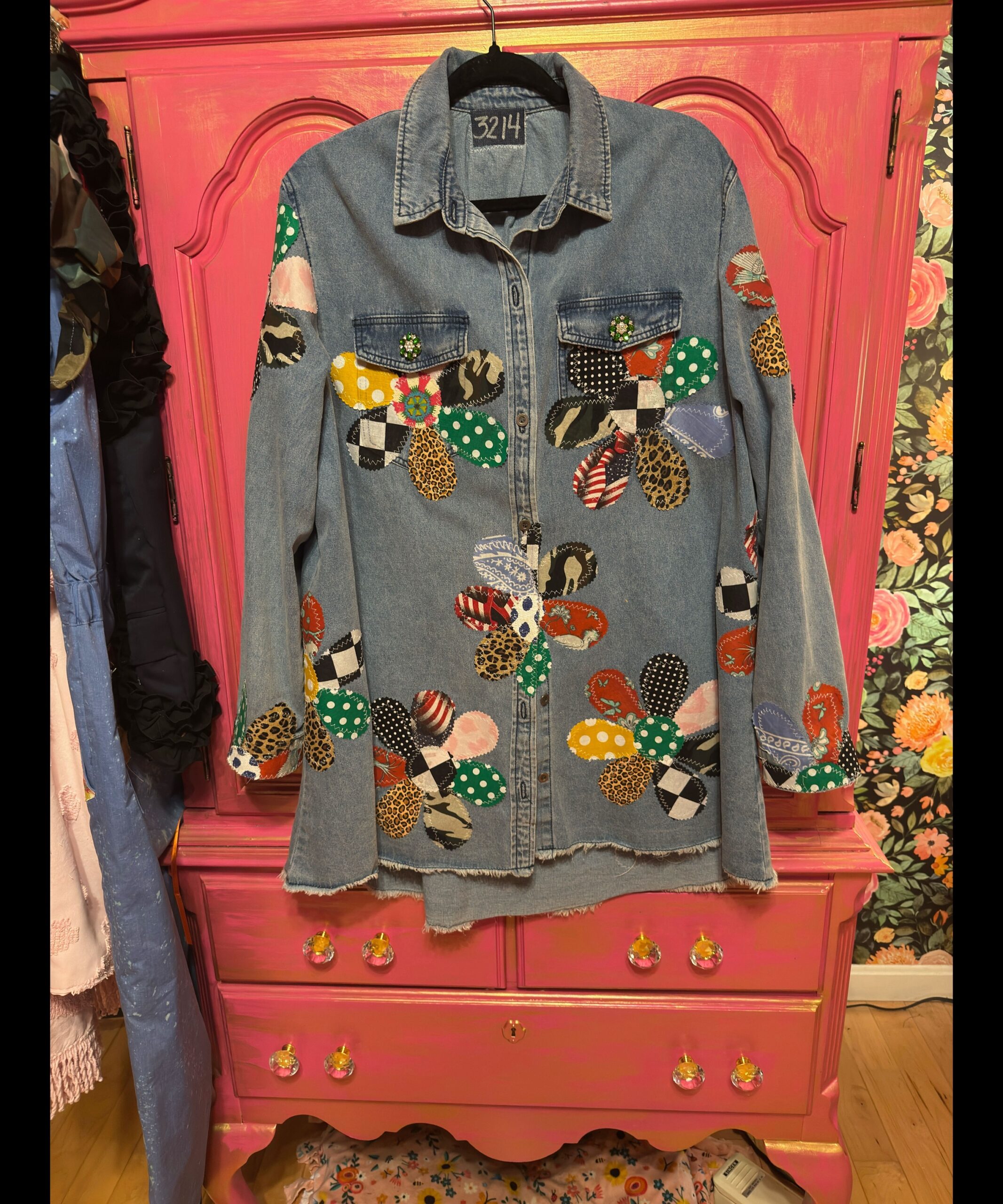 A denim dream with a twist! This long denim shirt-jacket is covered in bold, colorful flower patches for a fun, retro vibe. Perfect for layering or wearing solo when you want to stand out in style.