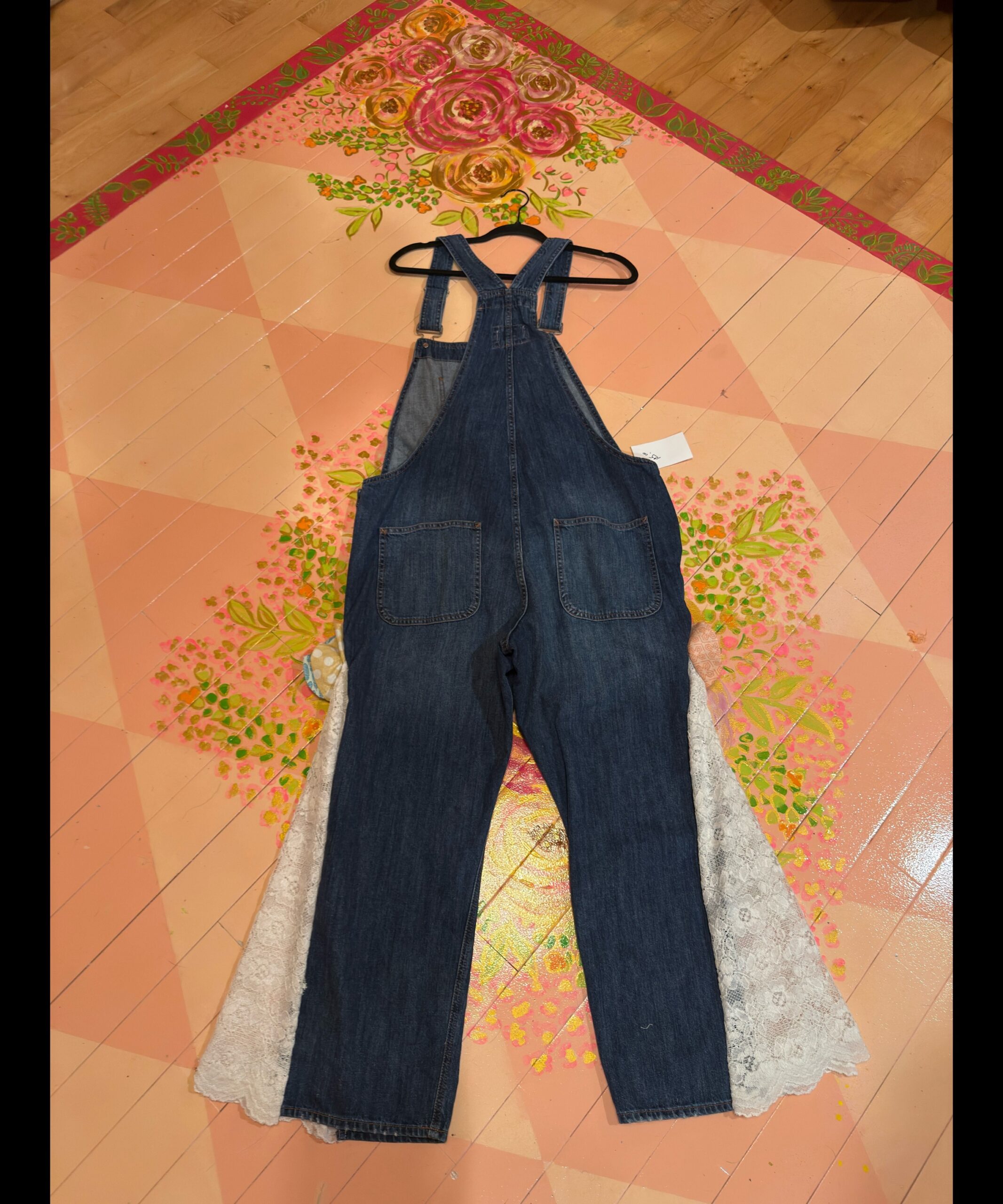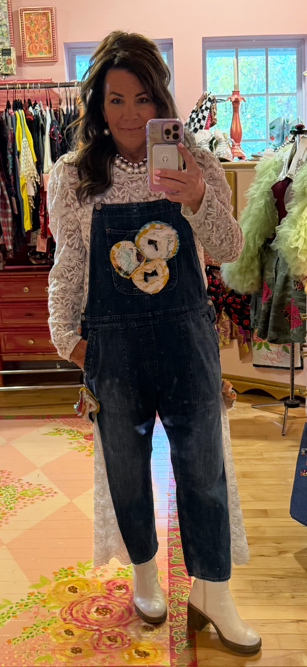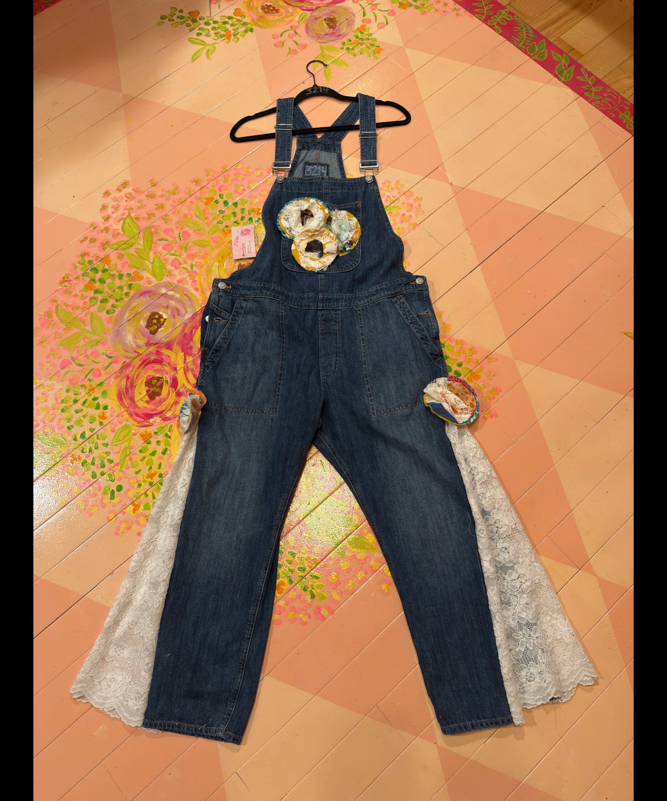 Denim gets a feminine twist! These one-of-a-kind overalls feature bold flower appliqués and lace inserts for a perfect mix of funky and sweet.