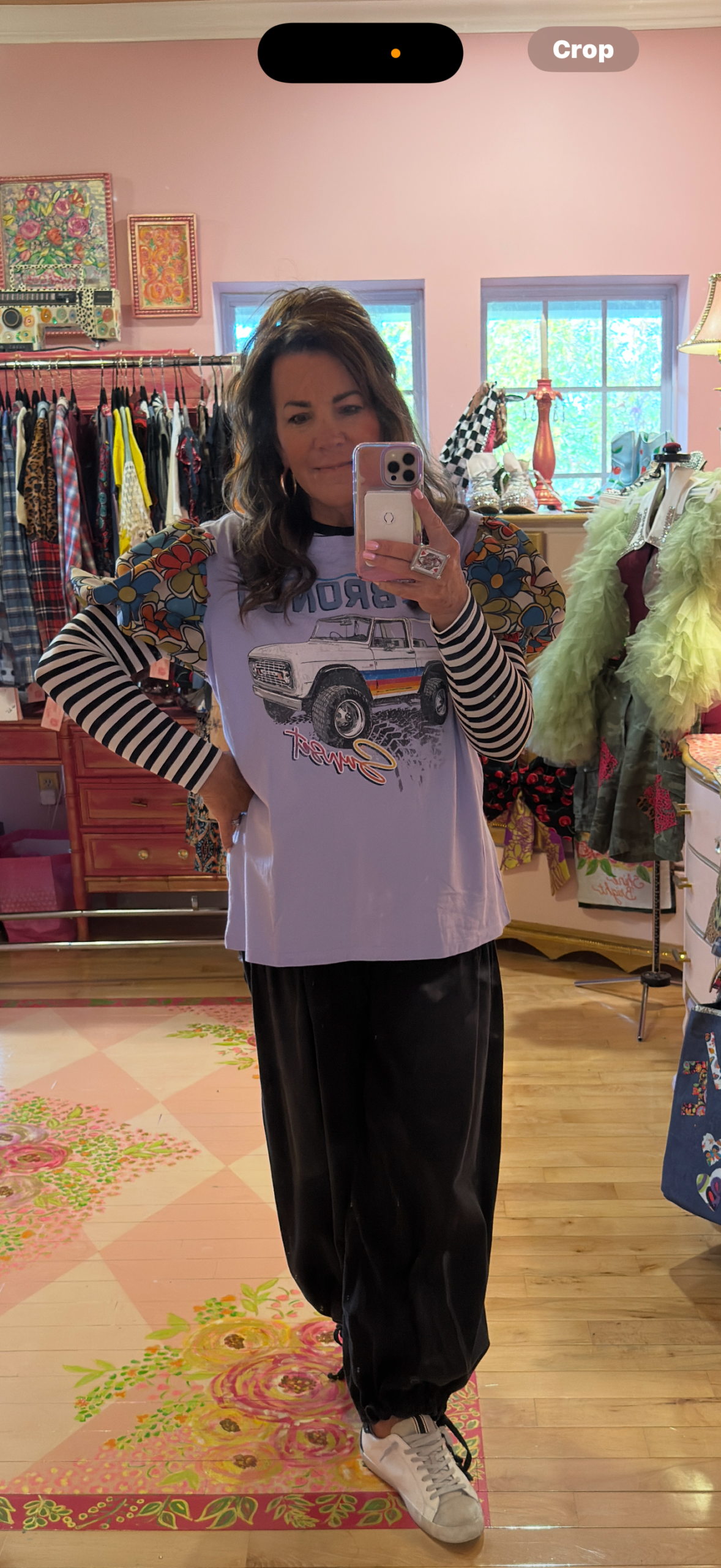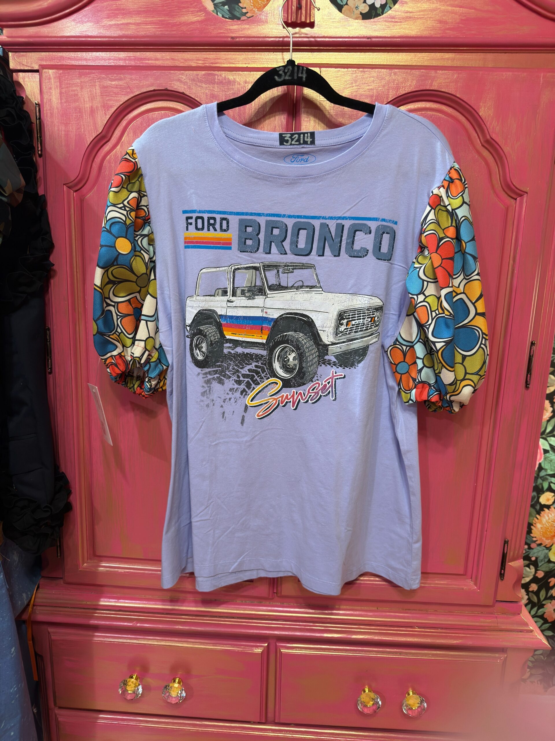Retro meets playful! This tee features a vintage Ford Bronco graphic and fun, floral puff sleeves for a pop of color and personality. Perfect for adding a little nostalgia to your everyday style!