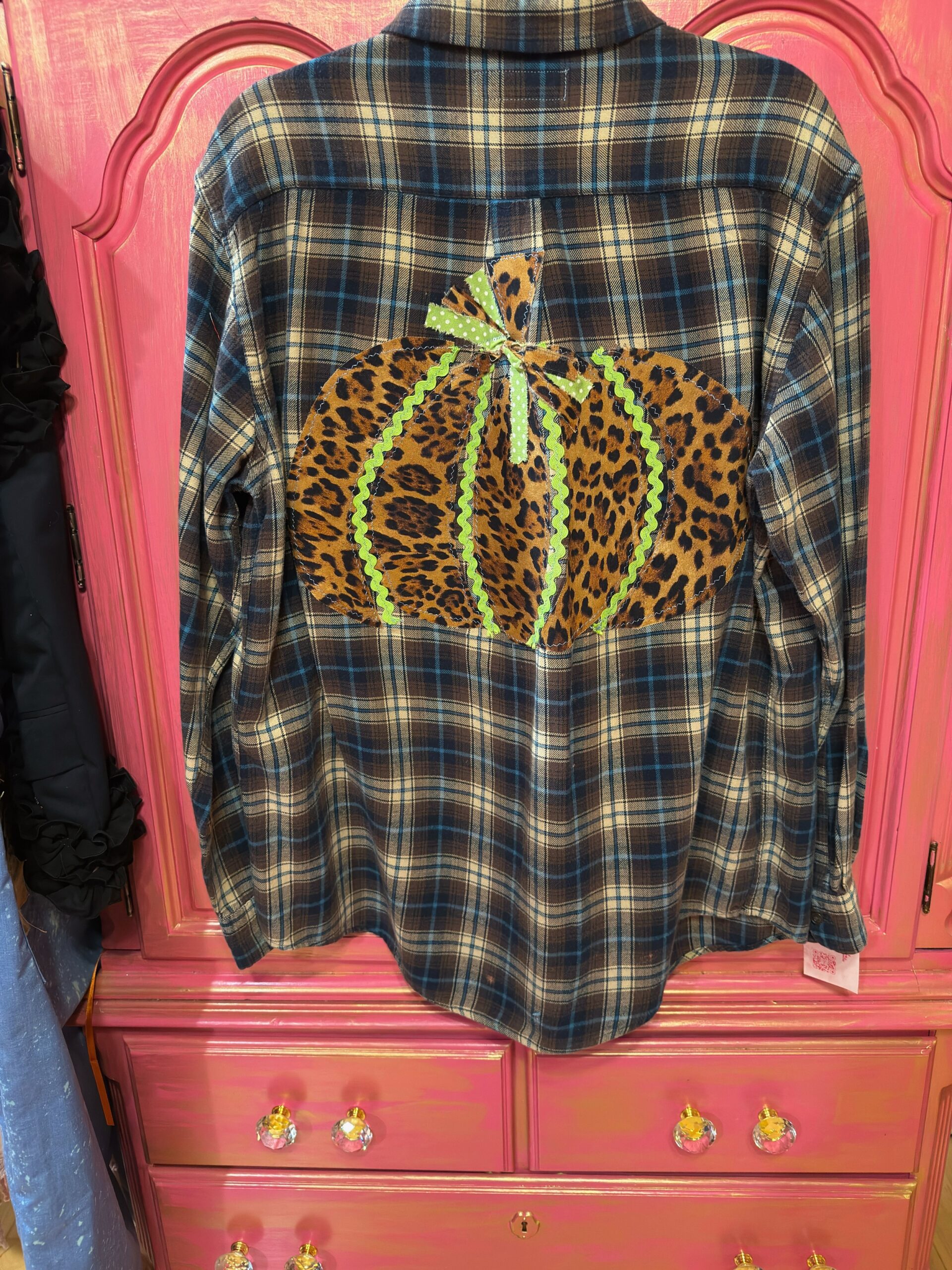 Pumpkin Flannel ShirtClassic plaid with a fun twist! This cozy fall flannel features a bold leopard-print pumpkin patch on the back — perfect for Thanksgiving or any autumn day.